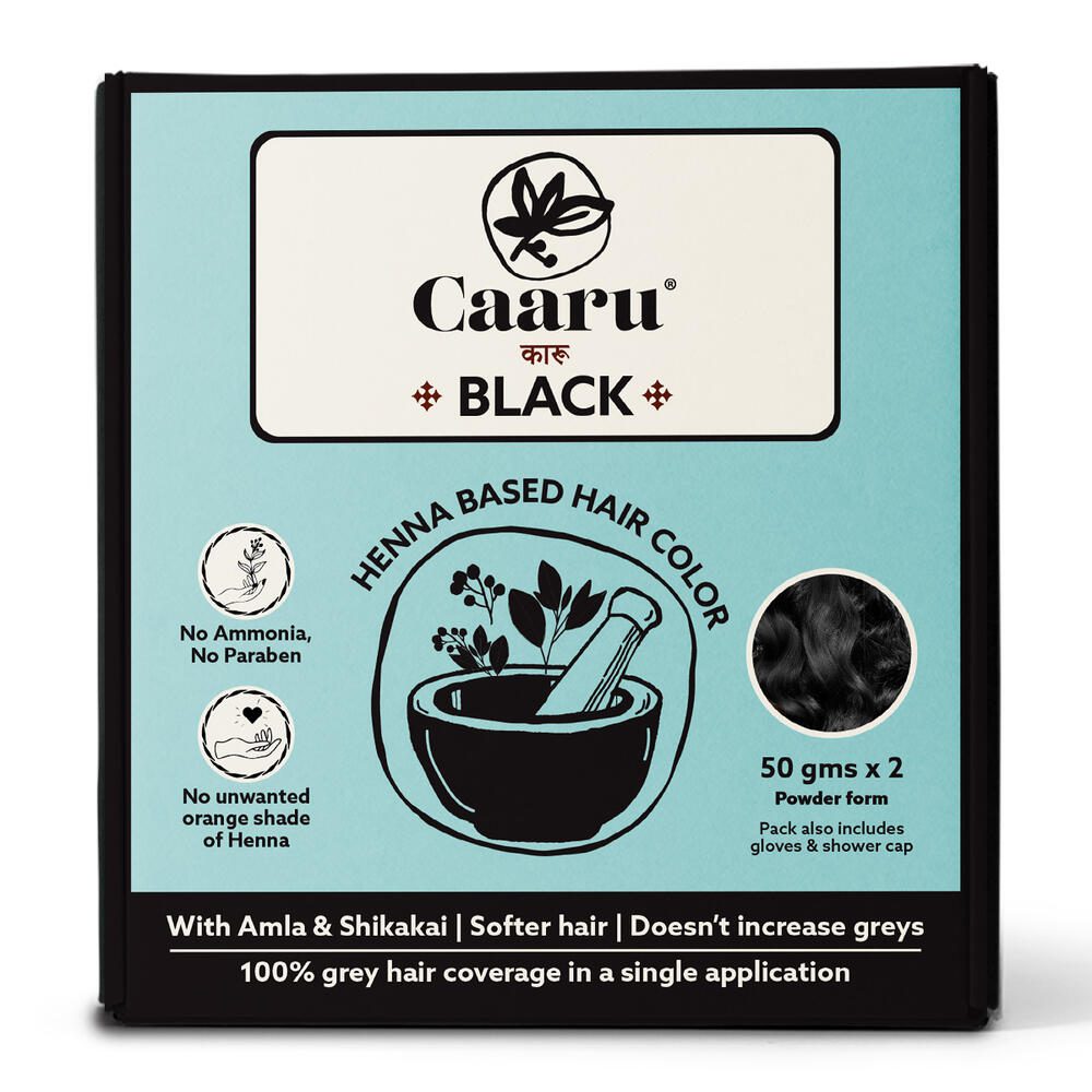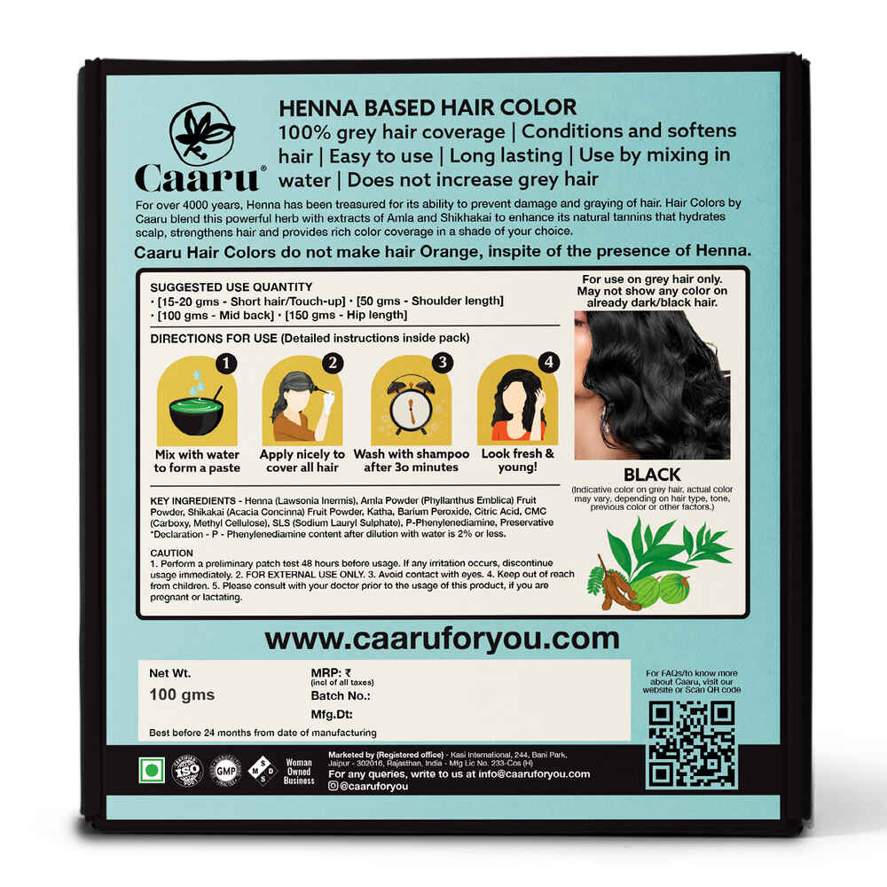 It is a lie that a 100% natural hair color that can cover your grey hair immediately, without a repeated process is completely chemical-free. A 100% natural dye will take longer. Our black henna hair color has minimum chemicals for lesser damage to hair and for different color choices. We aren’t claiming to be all natural. So all Caaru hair colors are henna-based, and are Ammonia and Paraben Free. These have minimum PPD, that remains 2%-3% only once water is added to make a paste before application. Hence, this is a safer but easy to use alternative for those looking for natural options.